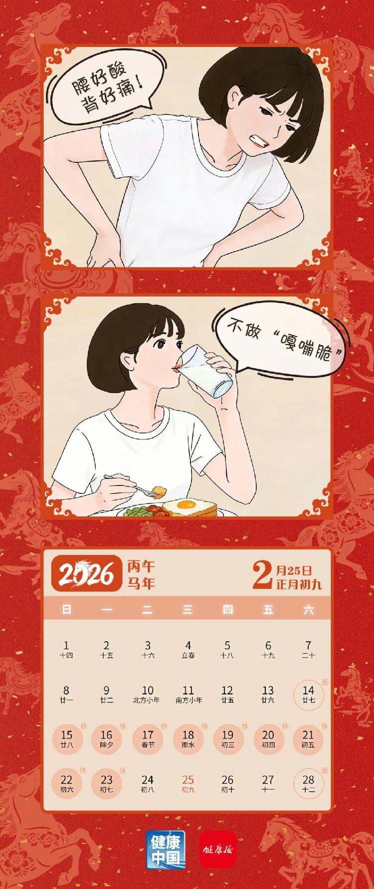 骨骼健康:继续保持强大的力量。马年小目标:通过每天的营养、锻炼和充足的阳光照射来维持骨量。新的一年,在日常生活中要多加小心。步骤一:遵循正确的饮食习惯。建议增加牛奶及乳制品的摄入量,多吃富含钙和维生素D的食物,少喝或不喝含糖饮料。第二步:科学练习。锻炼时注意自己的姿势以避免受伤,照顾好全身的骨骼和关节,让身体保持更长时间的活动。儿童青少年应保持良好的姿势和姿势,减少久坐,增加体力活动。建议您每天至少进行60分钟的中等到剧烈运动,每周至少进行3次力量训练或户外活动。中老年人应增强肌肉力量,进行平衡训练锻炼时要注意在安全、平坦的环境中进行,以免摔倒、骨折。第三步:定期检查。如果您超过 50 岁,我们建议您每年进行一次骨密度测试。 65岁以上的女性和70岁以上的男性应将骨密度检测纳入定期健康检查中。来源:公共卫生杂志 审稿:国家健康科普专家库成员、北京大学骨科主任医师孙浩林 规划第一医院:王宁 于云熙 制图:王俊科 编辑:王成峰 陈秀超