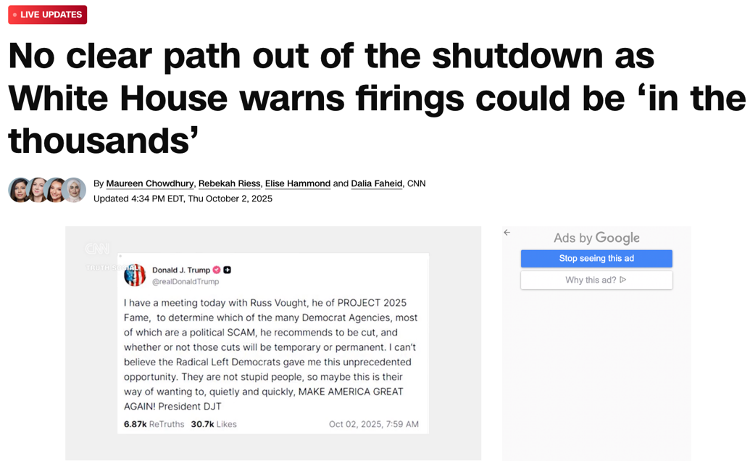 10月2日,美国政府在第二天关闭。共和党人指责民主党人关闭政府,因为他们想将健康保险基金用于非法移民,而民主党人要求虚假信息,以表明特朗普政府谴责了关闭。各方互相责备,到目前为止,已经显示出达成共识的迹象。关于这种情况,公众舆论分析了暂停可能会持续到下周,更有可能持续五到12天。同时,人们开始感受到停滞的公共服务和个人景点的“结束”影响,但这是公众可以直观地感觉到的混乱,专家们关心损害将变得更加多。分析师认为,真正的危险是无法释放关键经济数据,这是金融市场监督的迅速收缩,国家国家的减少速度缓慢信用,被迫暂停科学研究和公共卫生项目,以及联邦人才和承包商的信心被隐藏了。这些“无形”的裂缝是门引起的广泛破坏。美国有线电视新闻网(CNN)报告说,政府关闭将进入第二天,国会的谈判仍被困住,并且封闭可能会持续到下周。数据沉默:本周五可以取消就业报告,美联储必须“盲目猜测”。在美国,政府每月发布一个重要的经济数据系列,包括就业人数,失业率,价格趋势等。这些数字是对美联储系统的关键引用,以调整利率,公司投资和价值市场判断。没有禁运,停止可以中断或延迟这些数据的汇编并释放。最现实的事情是计划于10月3日发布的每月就业报告面临着一个困境将被迫取消。 10月28日,美联储将举行常规会议,以确定利率政策。如果该报告不提供有关劳动力市场导向的专门数据,则美联储政策的制定将失去重要的决策参考。美联社报告说,政府关闭阻止了劳动统计办公室释放数据的能力。实际上,过去关闭期间也有类似的情况。在2013年底,就业报告被迫推迟,因此,由于缺乏更新的数据,市场和政策已陷入盲目猜测。这次,如果报告不存在,则意味着市场和政治都必须基于不完整的信息和“盲目猜想”做出决定。美联社报告说,政府关闭将导致出版经济数据的中断,这对美联储的相关决策提出了重要的挑战。监管机构Y麻痹:经SEC的90%以上的员工获得了许可,并批准了新的几乎被暂停的项目。在关闭期间,根据紧急计划,股票和价值委员会(SEC)已将超过90%的雇员暂停,只有少数人可以维持紧急法律和市场监视的应用。同时,未来的贸易委员会(CFTC)也大大减少了其数量,仅保留了约5.7%的员工以维持其基本职能。作为回应,该律师事务所发出了通知,托希斯客户在政府关闭期间无法介绍OPI文件,并且大多数SEC文件无法处理。发生的事情是,该公司停止了OPI列表,停止了新的行动和合并和收购的节奏,从而增加了“ Hutop”的波动和仲裁的风险。 。实际上,在2018年至2019年之间的35天结束时,许多公司不得不推迟其列表或融资计划,资本市场节奏一次中断。如果监督被打破,新项目将获得批准,合并和收购,就会停止对价值和其他活动的发行,这使投资者销毁。路透社报告说,政府的关闭已导致金融监管机构拥有很少的员工来维持运营。 IPO评论的延迟会影响投资者的感受。信用侵蚀:Allestlocks降低了成绩和信任。政府的关闭并不是违反行为,但预算中重复的极端情况无疑会使国际投资者怀疑美国体系的稳定性。实际上,信用评级机构长期以来一直认为这种政治不确定性。当惠誉(Fitch)在2023年降低美国主权评级时,他特别提到了预算和预算谈判过程的“高风险”性质。闭幕开始后,惠誉发表了另一篇文章,并在简短的T中发表了ERM,为美国的主权资格建立了关闭。 uu.aunque没有影响,封闭突出了政策和治理结构制定方面的更深层次挑战。该报告还警告说,如果关闭继续,长期公共财务信贷可能会受到压力。几个小时后,从本回合开始,规避市场风险的感觉就大大增加了。债券的收益率波动,短期内美元削弱,黄金价格上涨。从长远来看,贷款成本将增加,投资者对实现美国政策的信心少一些,美元可能会慢慢侵蚀作为正全球储备金。官方Fith Fitch Ratings Fitch评级网站于10月1日发表了一篇文章,该文章称该暂停强调了长期的政治决策和治理问题。科学研究和公共卫生中的中断:延迟比他想象的要严重。从关闭当天,国家卫生研究所(NIF),疾病控制与预防中心(CDC)和其他机构预计将停止多个科学活动和公共卫生。它们是流感的秋季和冬季,由于人员许可和预算中断,这些机构的疾病监测能力可能会受到破坏。从历史上看,NIH在2013年底暂停了新的临床试验。当时,CDC疾病的监视减慢了,新的FDA药物的批准也被推迟了。在那个时期中断之后,花了几个月的时间才逐渐恢复节奏。分析人士认为,如果持续关闭以及批准的延误和延迟样本的延迟,则被迫暂停的相关研究可能会经历较长的延误,而不是简单地“几天的损失”。路透社报告说关闭政府的RE将迫使41%的卫生机构人员获得许可,包括卫生信息的传播Pumblica,医学研究和承包商的监督。每次关闭时,联邦雇员都不应该付款,他们的道德令人沮丧。对这个时代更加严重的是,特朗普在10月2日的一次采访中说,可能会有项目和削减草案。白宫管理和预算办公室(WBO)已要求该机构准备解雇计划,在此期间,许多人的立场可能会被永久解雇。一些分析人士说,美国政府在被束缚后于2013年关闭,联邦雇员在领导层方面的信心急剧下降,许多年轻人认为这已经大大减少。人们不再选择在公共部门工作。如果解雇在此期间真正开始,那么政府人才的吸引力将大大降低,这将大大降低使用联邦人才管道和“记忆机构”会导致不可逆