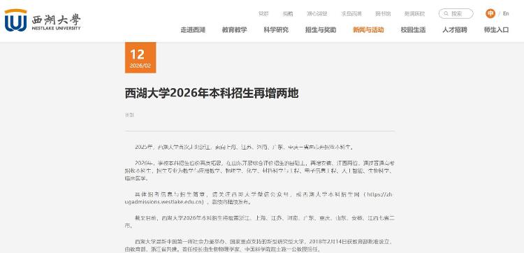 3月17日,有媒体报道称,2026年,西湖大学将首次在山东、安徽、江西招收本科生。山东地区采取综合考核招生方式,安徽、江西地区采取高考招生方式。 30%,高中学术水平资格考试成绩占10%。在山东省注册的学生不得超过10人。其中,综合考试由西湖大学独立组织,通过笔试和面试的方式对学生进行考核。据西湖大学官网显示,西湖大学位于浙江省杭州市。是一所由社会力量举办、国家重点支持的新型研究型大学。 2018年2月14日经教育部正式批准,是教育部与浙江省共建大学。 20年26日,西湖大学2026年专科学费覆盖浙江、上海、江苏、河南、广东、重庆、山东、安徽、江西七省两市。 2026年西湖大学本科招生面积将增加(来源:西湖大学网站) 在山东,综合考核模式具体为高考成绩占60%,学校综合考试成绩占30%,高中学历资格考试成绩占10%。综合工作人员告诉积木新闻,此次测试在杭州进行,由西湖大学独立进行,包括笔试和面试。西湖大学上述工作人员表示,此次山东招生不超过10名学生,高考选修科目必须包括物理、化学。到2030年,学校预计将有5000名学生,其中3000名博士生八年级考生和 2,000 名本科生。进入本科阶段后,前期以通识教育为主,后期以专业教育为主。这所学校是培训的典范。通过戴尔获得学士学位。从学士到博士学位仅需短短8年时间即可获得博士学位。我们学校也有资格获得豁免。积木新闻记者注意到,该校的大学学费为每学生每学年6000元。全国大学生宿舍有四五间卧室、两间客厅、两间浴室。每个人都有一个独立的卧室。住宿费用每年1800元至2200元不等。西湖大学校长施一公表示,西湖大学校长施一公,是广大学生们在学术和批评方面的基础,是学生们在学术和批评方面的基础,是青少年的科学研究精神。苏尼奥斯和目标以中国的名义为世界科学和科学研究贡献一份力量。